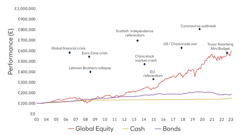 The below graph from NatWest covering the period between 2003 and 2023 highlights this, showing the return on global equities (shares), bonds, and cash at critical points in history. Although cash remains relatively level, the eventual returns from bonds and equities would have been higher.